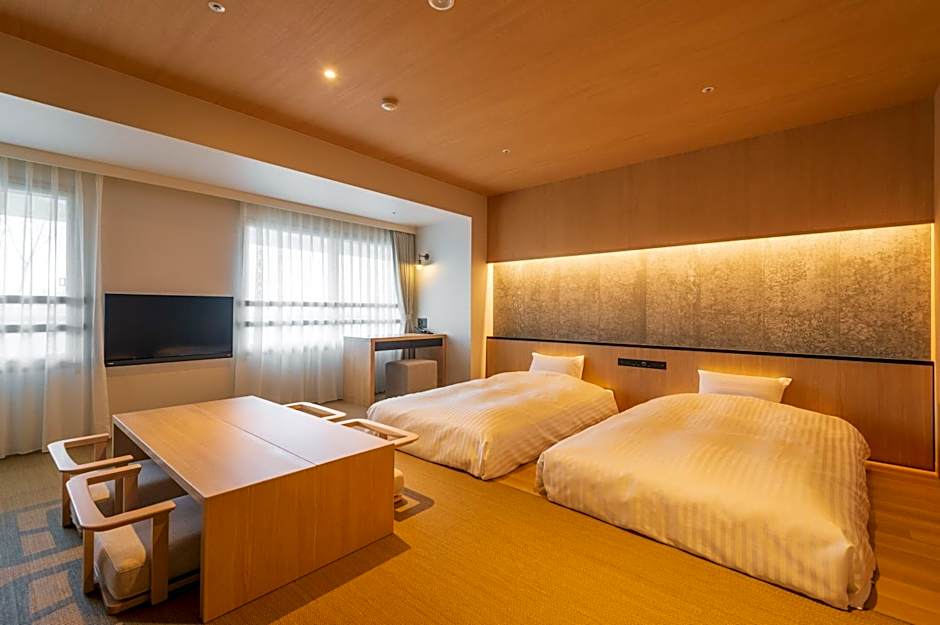 This family room is air-conditioned and has a seating area with a flat-screen TV, tatami, a wardrobe, a safe deposit box, as well as an electric kettle. The unit has 2 beds.